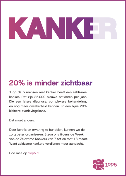 In de Week van de Zeldzame Kankers (7–13 maart 2026) vraagt 1op5 Stichting voor Zeldzame Kankerpatienten, landelijke aandacht voor de grote groep patiënten met een zeldzame vorm van kanker.